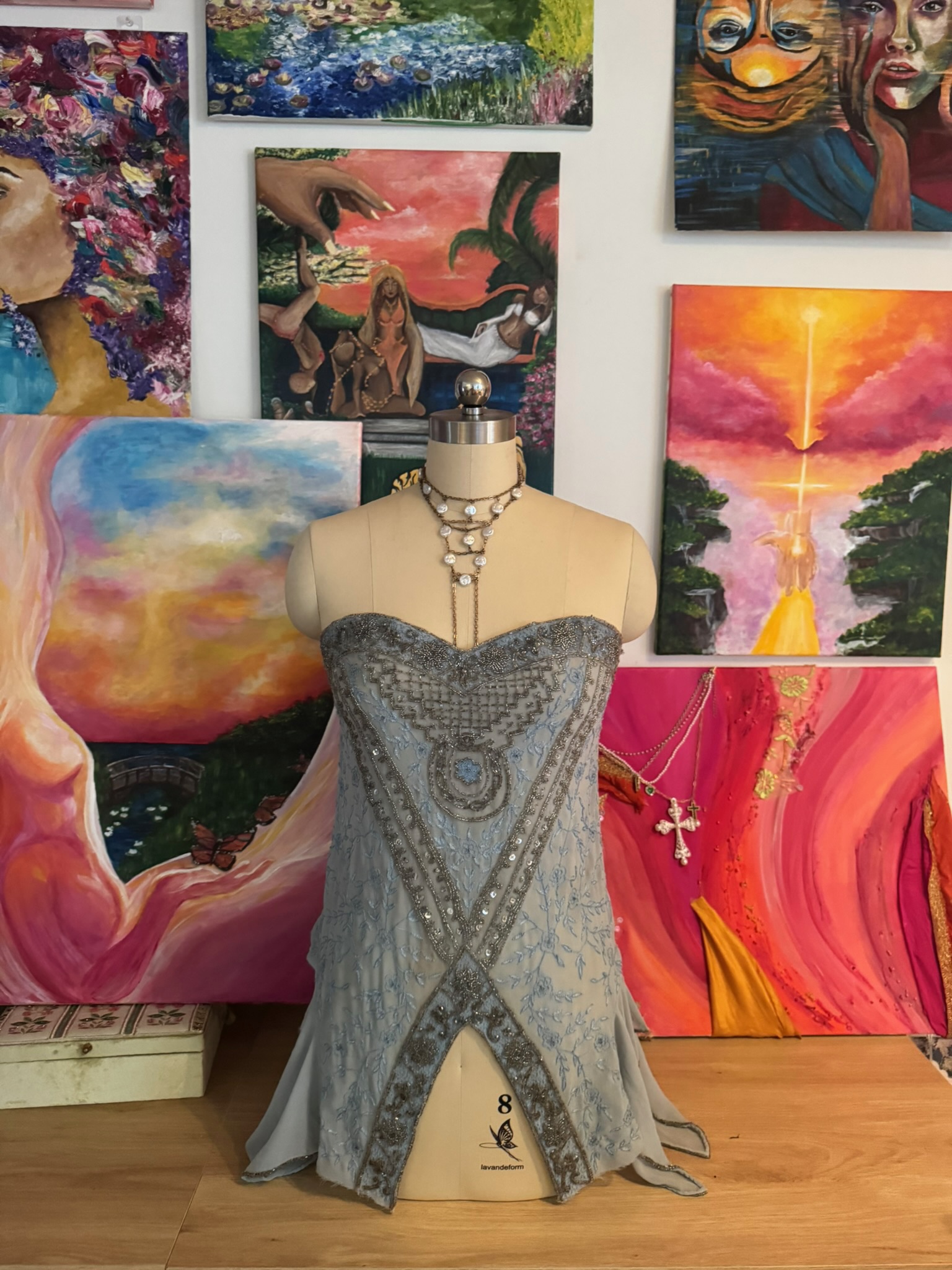An icy-blue strapless top adorned with intricate silver beadwork and delicate embroidered florals. Featuring a sculpted sweetheart neckline and flattering V-shaped detail. This piece moves effortlessly and catches the light with every step. Romantic, ethereal, and one of one.