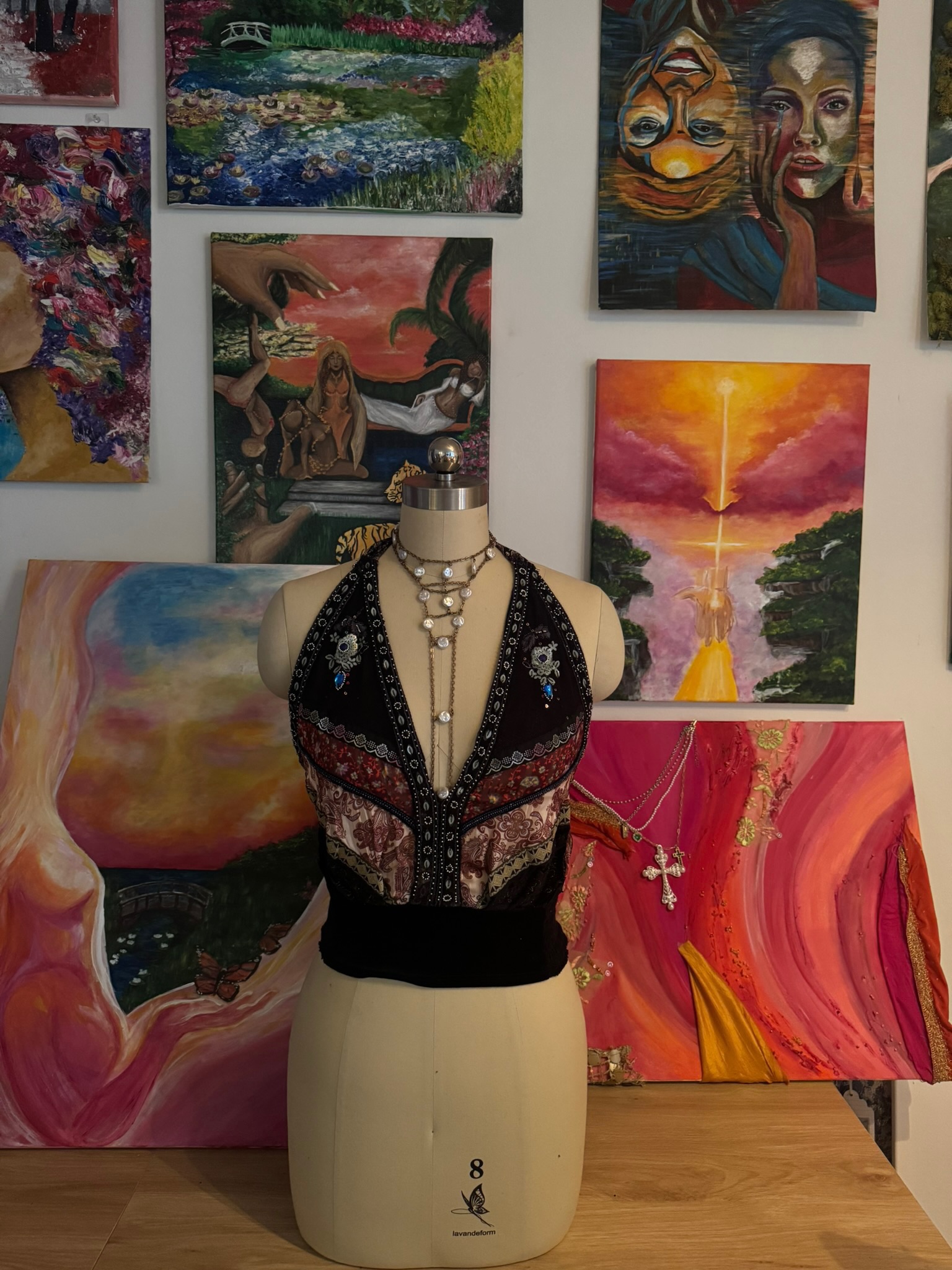 A one-of-a-kind halter featuring a deep plunge neckline, rich burgundy paisley panels, and intricate black trim. Structured, flattering, and unapologetically bold. This is wearable art with edge.