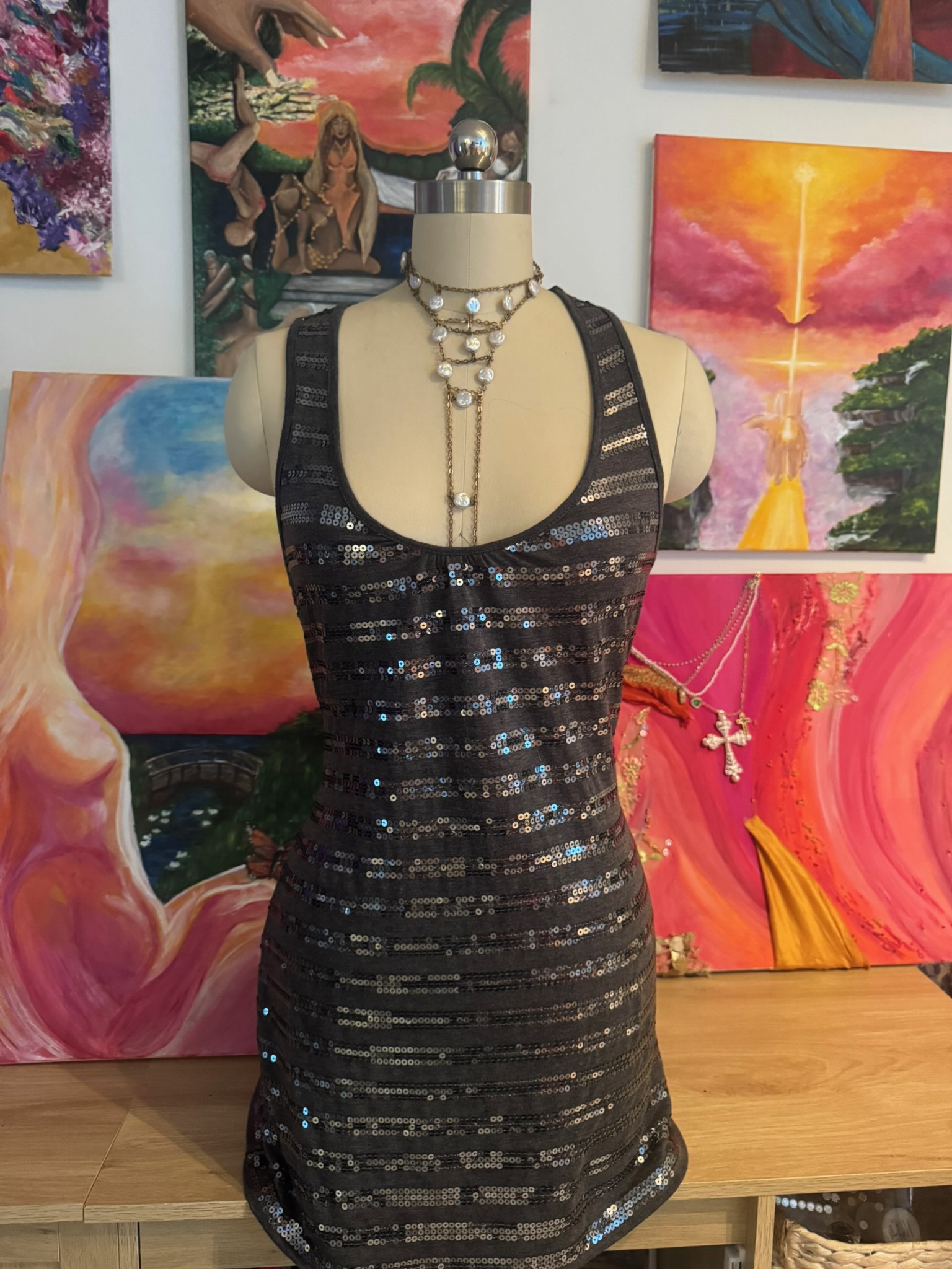 A sleek charcoal bodycon mini featuring subtle horizontal striping and all-over shimmer detailing. Designed with a flattering scoop neckline and figure-hugging silhouette, this piece catches the light effortlessly with every movement. Minimal, bold, and made for nights out — pair with heels for a classic look or layer with boots and a jacket for added edge.