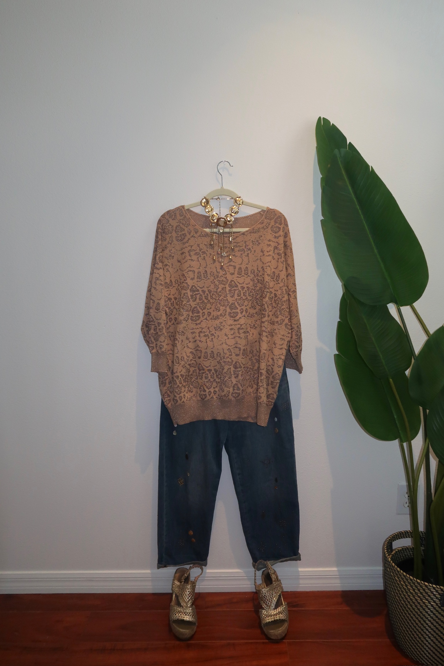 Mocha Shimmer Leopard Knit Soft mocha-toned sweater featuring an all-over subtle leopard print with a delicate metallic shimmer woven throughout. Designed with a relaxed silhouette, three-quarter sleeves, and ribbed cuffs and hem for an easy, flattering fit. Cozy but elevated — perfect with denim, trousers, or layered over a slip skirt for that effortless luxe feel.