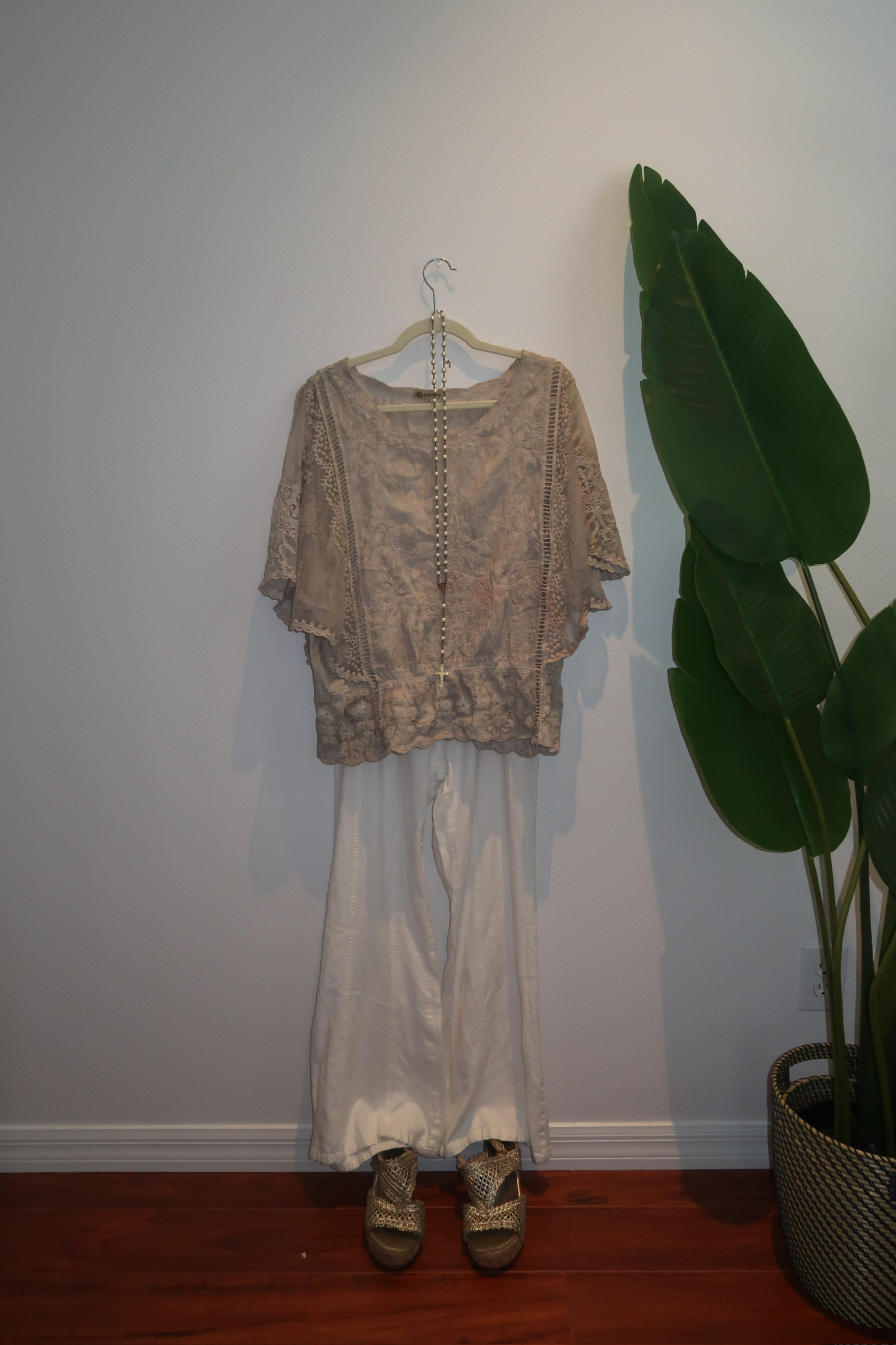 Dusty Taupe Lace Blouse Soft, romantic blouse in a muted dusty taupe tone featuring delicate lace paneling, subtle floral embroidery, and scalloped trim along the sleeves and hem. The relaxed silhouette and slightly gathered waist give it that effortless, vintage-inspired drape. Lightweight and airy with beautiful texture throughout — easy to style tucked into denim, paired with flowy trousers, or layered with long necklaces for that soft bohemian feel.