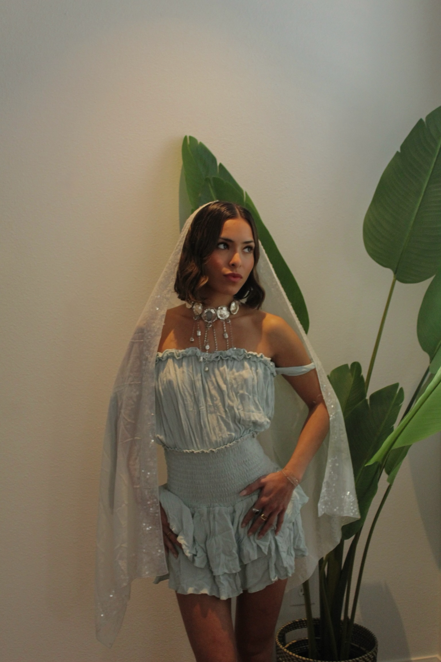 Sea Mist Ruffle Mini Dress Soft, romantic mini in a dreamy seafoam blue tone — light as air and effortlessly feminine. This piece features a delicate off-the-shoulder neckline with subtle ruffle trim and adjustable tie straps for a customizable fit. The bodice is fully smocked for that flattering, sculpted silhouette, while the skirt flows into layered, cascading ruffles that move beautifully with every step.
