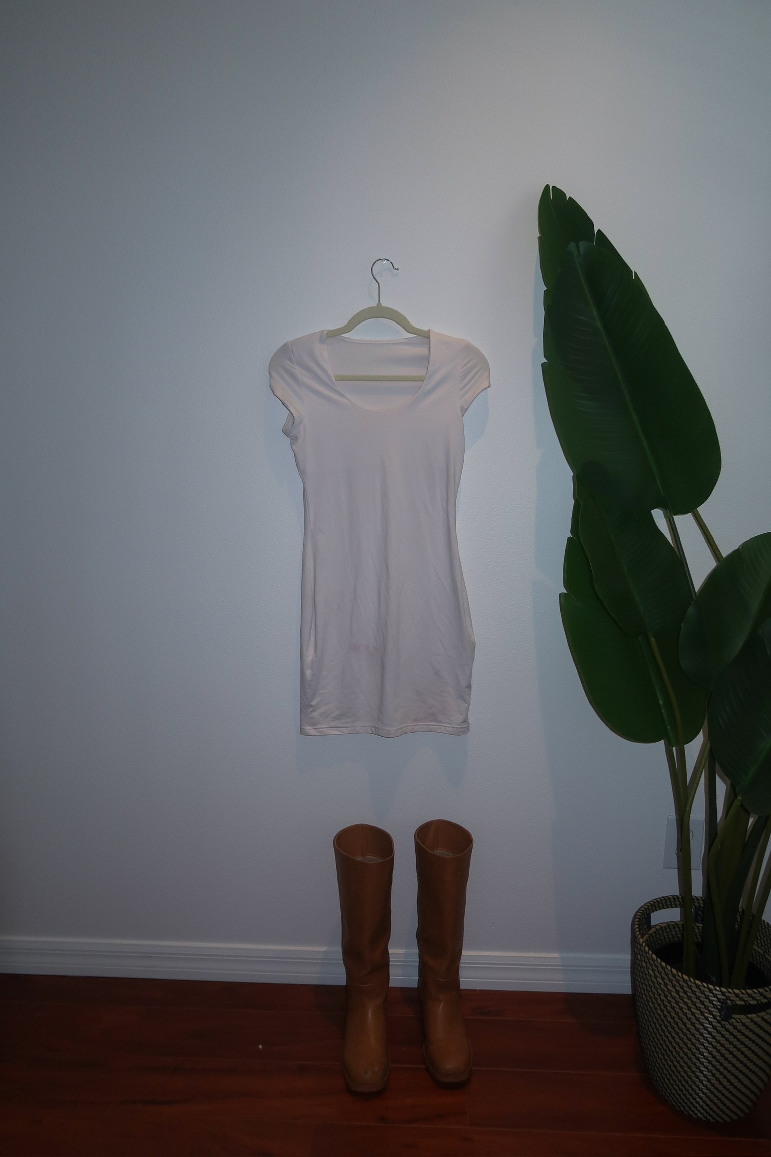 Your forever staple — a clean, body-skimming white mini dress with a soft scoop neckline and cap sleeves. Minimal, flattering, and endlessly versatile. The smooth stretch fabric hugs gently without feeling restrictive, making it the perfect base layer or standalone piece. Simple silhouette. Perfect fit. Zero effort.