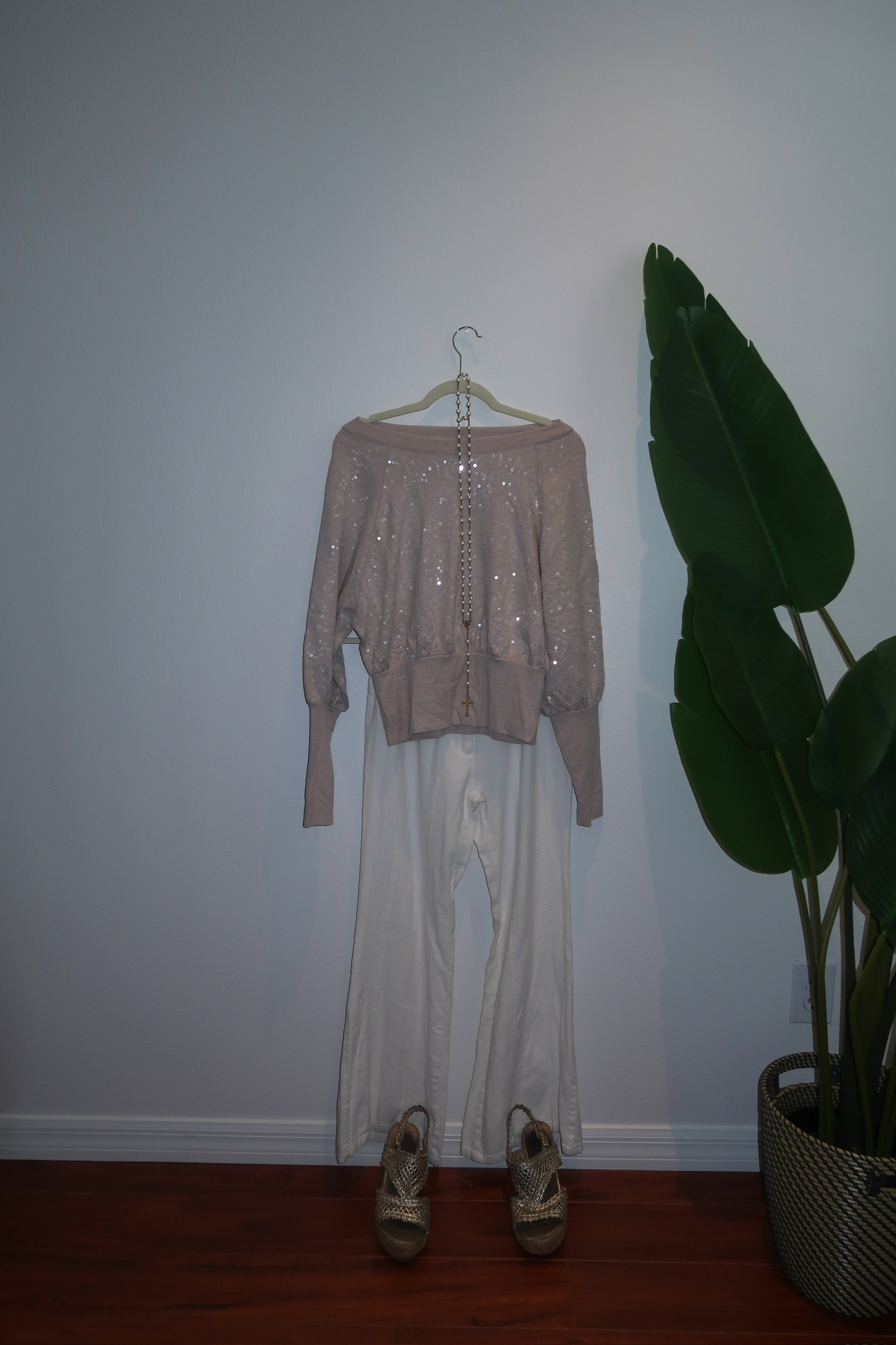 Champagne Glow Off-Shoulder Sweater Soft, slouchy, and dusted in subtle shimmer — this champagne-toned knit is made to glow under soft light. Designed with a wide neckline that can be worn off the shoulder, it drapes effortlessly for that relaxed, feminine silhouette. Extremely soft interior Pair with - white mini/ midi/ maxi skirt - jeans - white pants - & much more