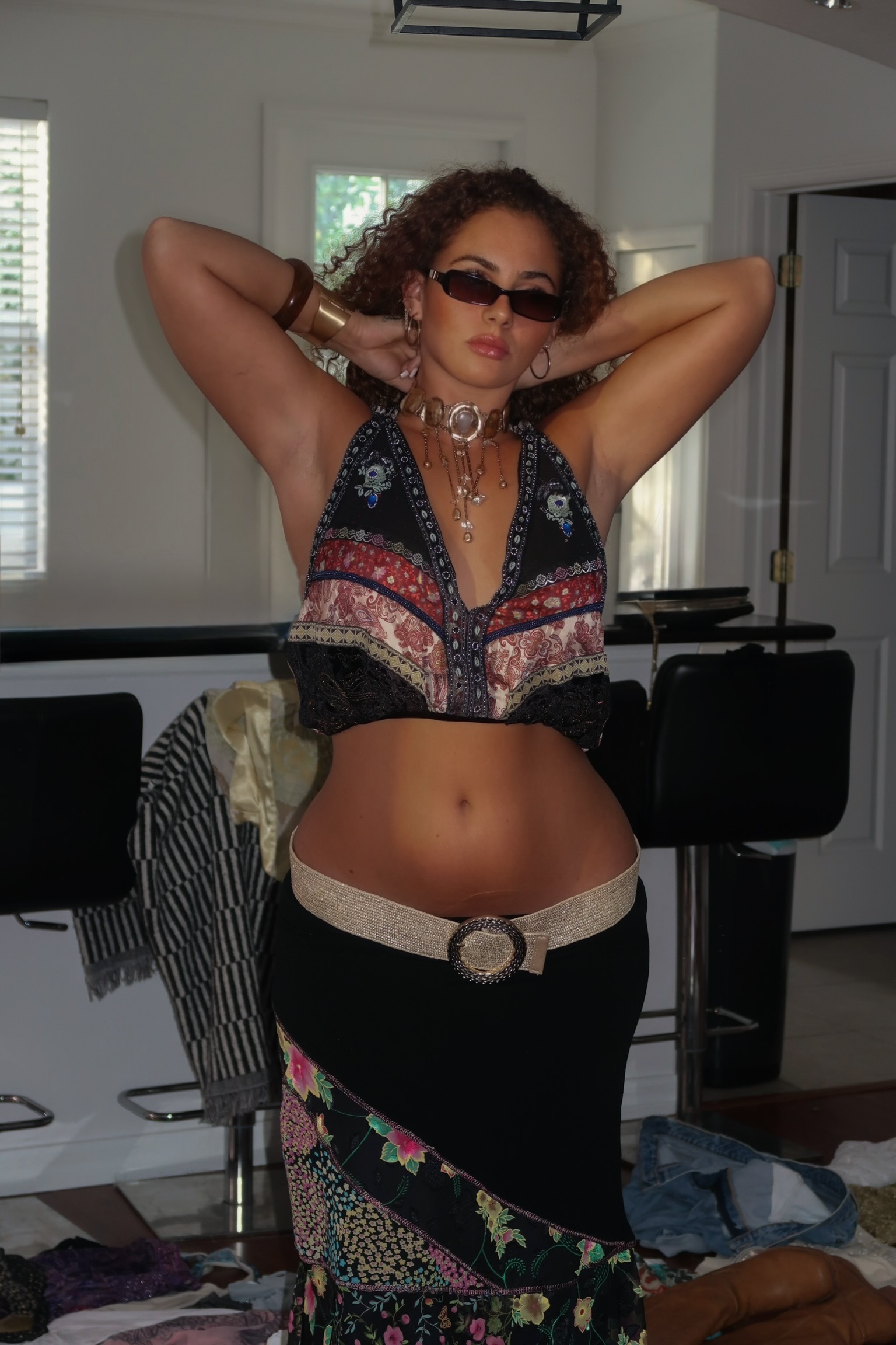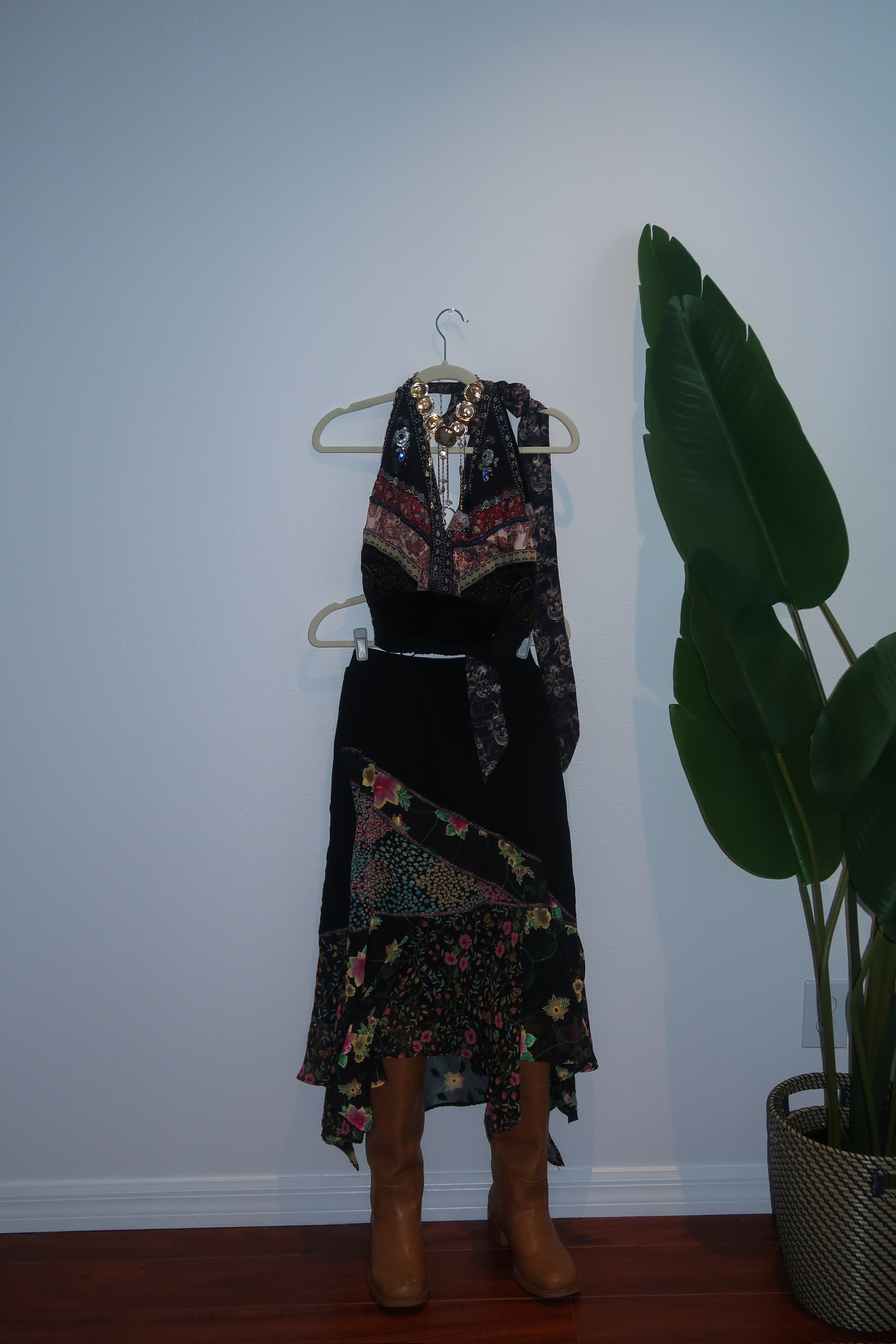 Midnight Bloom Asymmetrical Skirt A romantic, flowy midi skirt in a deep black base with mixed floral patchwork detailing throughout. Designed with an asymmetrical layered hem, it moves beautifully with every step, creating that effortless bohemian silhouette.