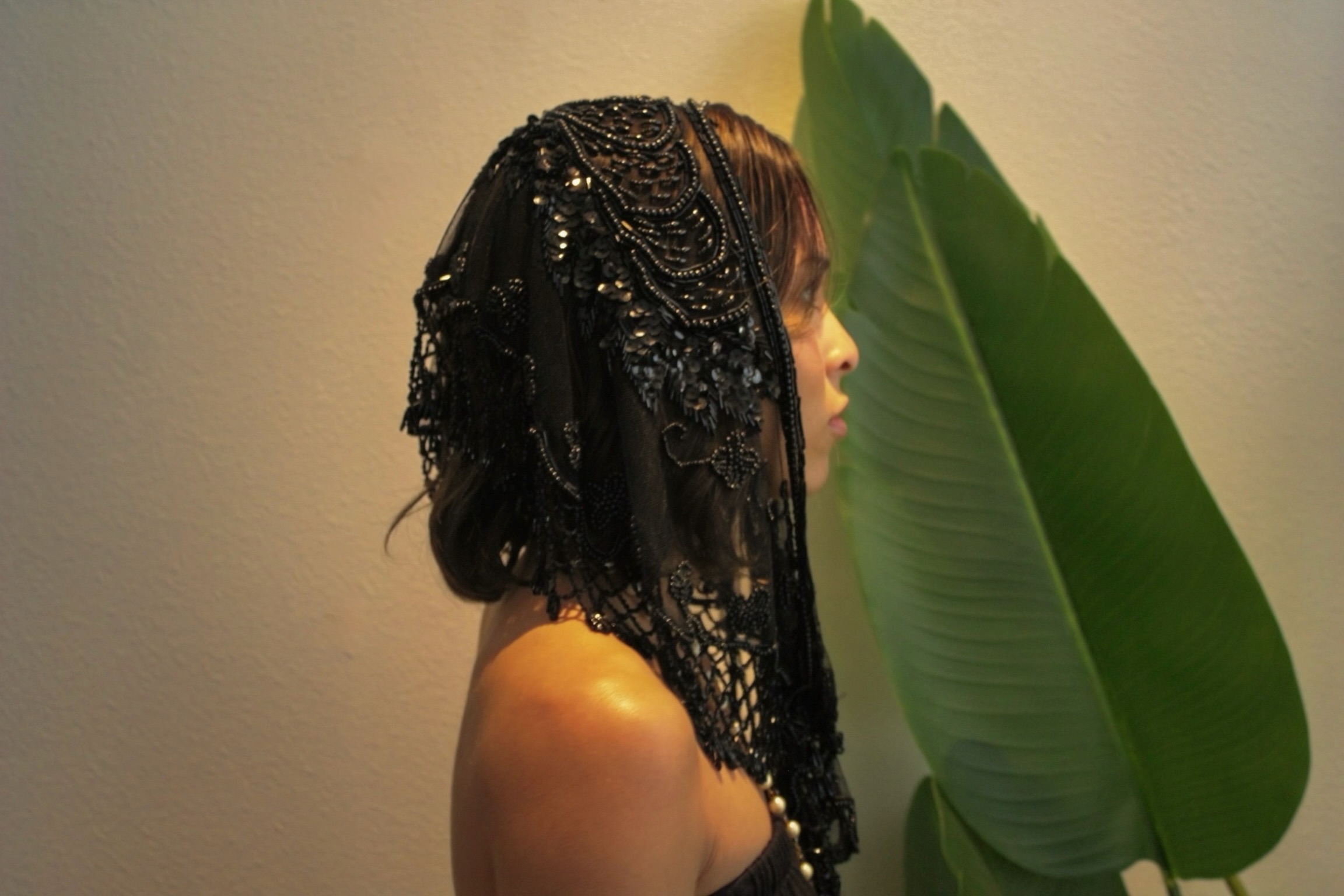 An intricate black lace pashmina-style headpiece designed to drape softly over the crown and frame the face with dramatic elegance. Crafted from sheer mesh and detailed with hand-beaded embroidery, it features layered scalloped patterns, delicate netting, and subtle sequin accents that catch the light with every movement.