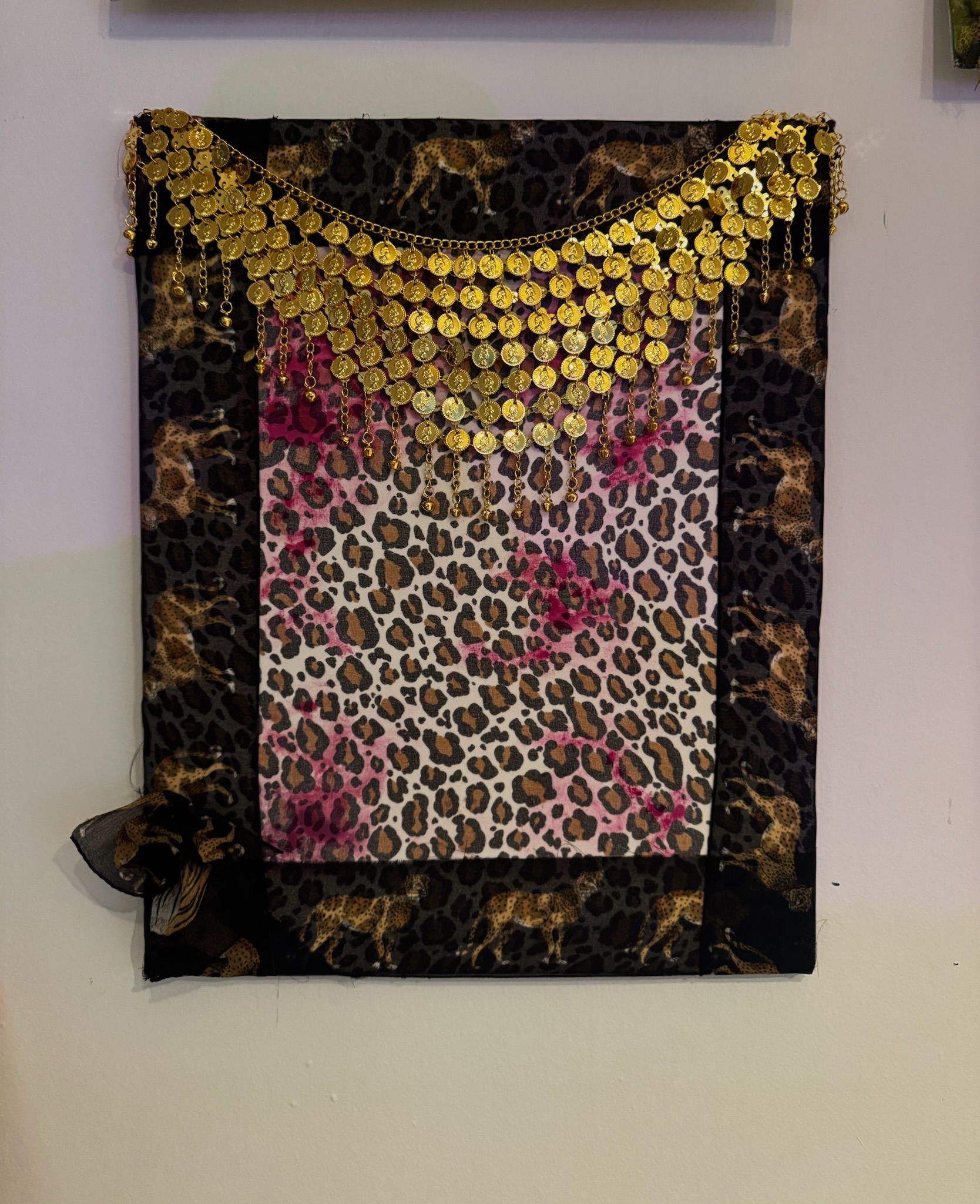 Bold leopard print textile featuring a vibrant pink gradient center, framed in rich black-brown animal motif. Adorned with luxurious cascading gold coin fringe across the top, dense rows of shimmering medallions on chains create dramatic movement and opulent sparkle. Raw-edged, bohemian-maximalist design with sheer black accent detail.